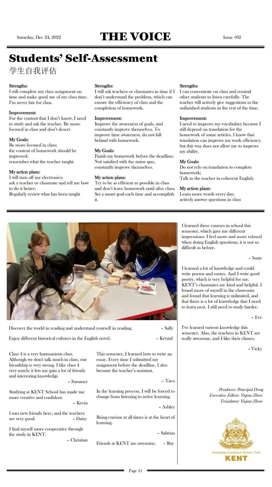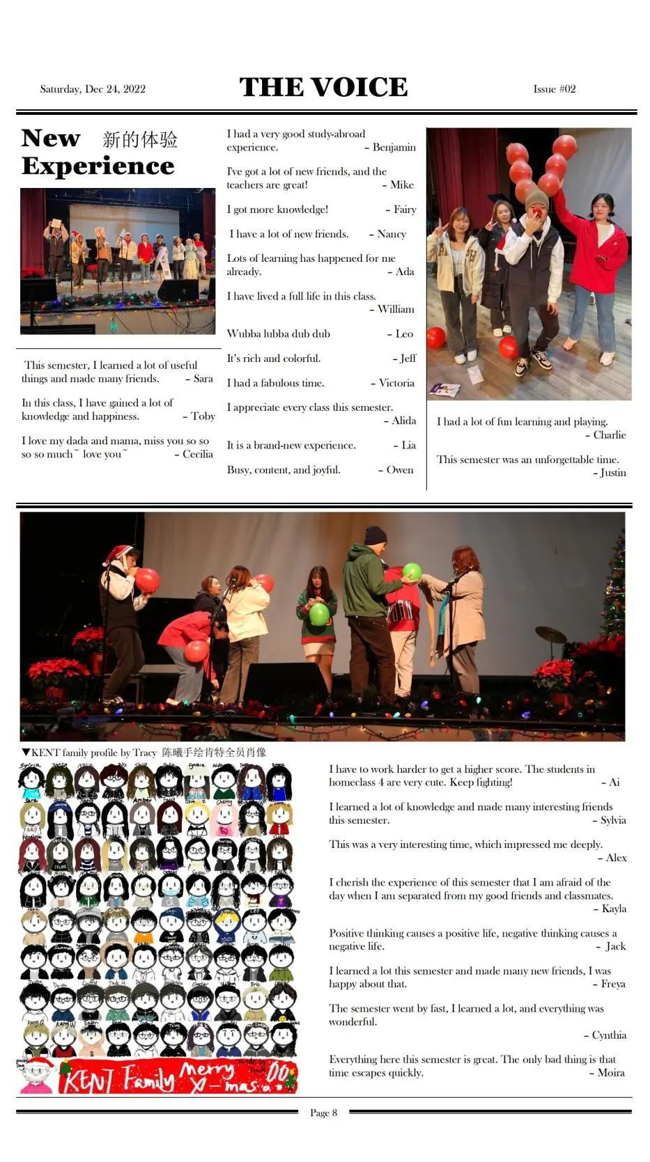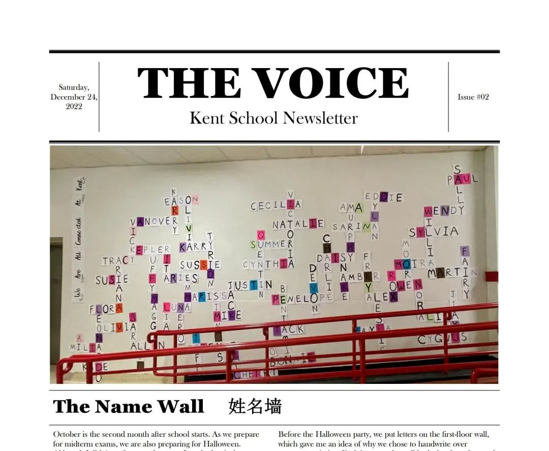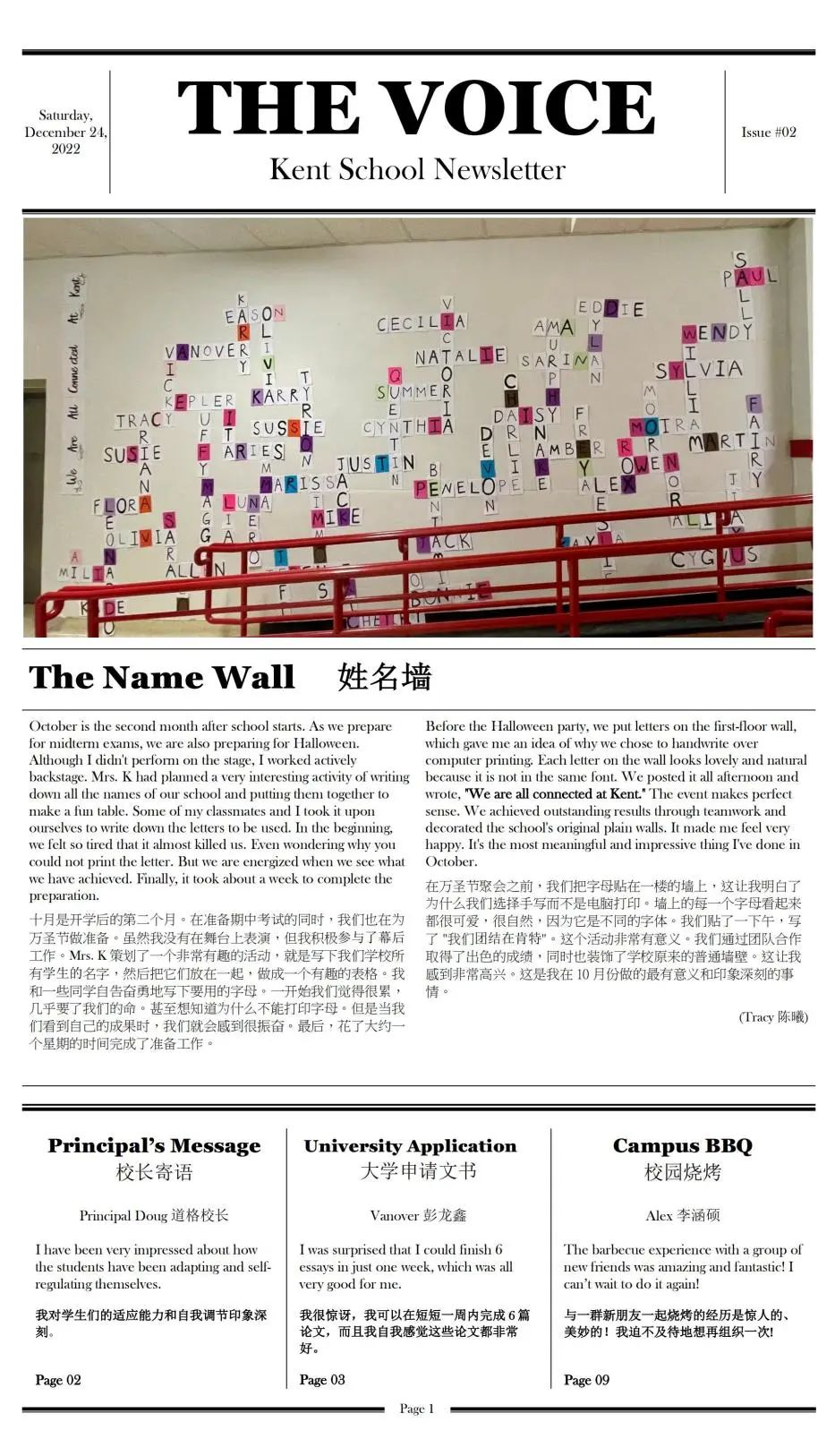 校刊《肯特之音》第二期发布。本期内容由线上线下学生共同参与投稿,还有Doug校长年度回顾,全员参与度超高。