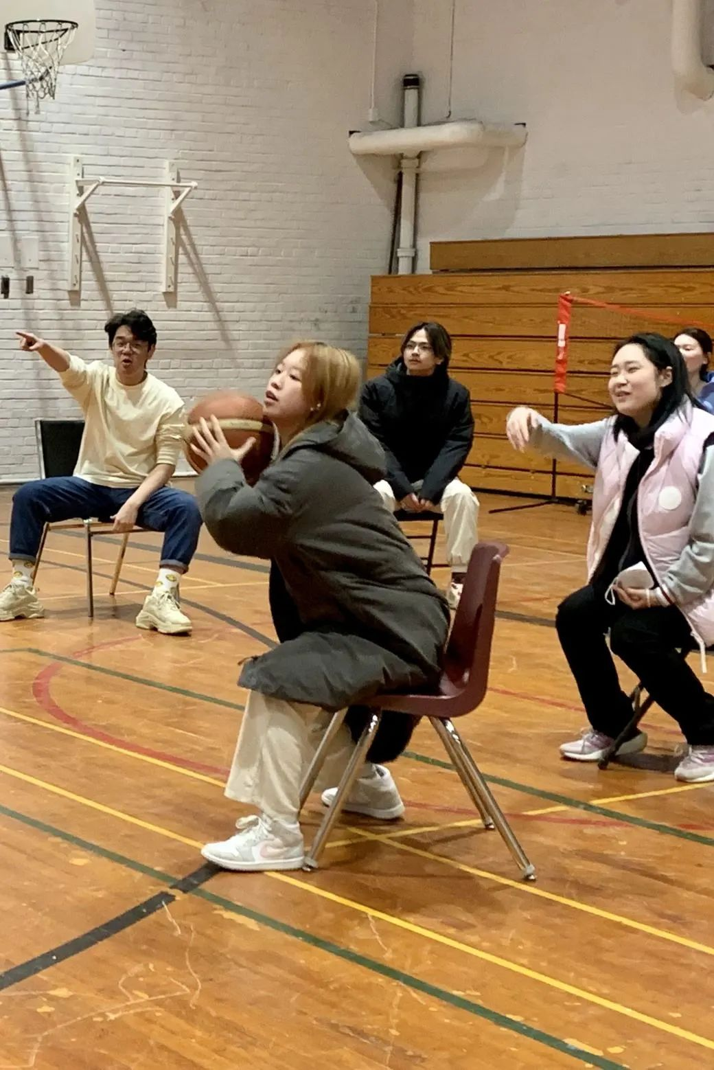 恰如其名,这个游戏就是坐在椅子上打篮球。每一个小组在开赛前有策略地放置好自己的椅子,比赛时在不离开椅子的情况下传球、投篮。在两轮比赛之间,每个球队可以决定是否重新制定战略,改变座椅的摆放。