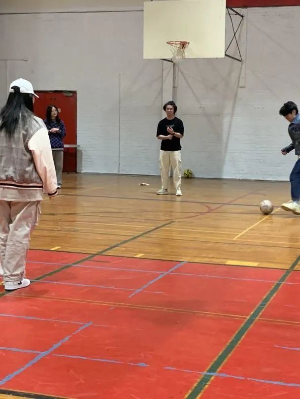 这是一个由学生独立组织的游戏。同学们围成一个圈相互踢球传球,唯一站在中间的同学为“中间猴”。若传球过程中被“中间猴”抢球了,那上一位传球的同学就接替成为“中间猴”。